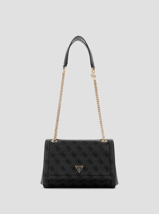 Make a timeless statement with the Black Logo Noelle Convertible Crossbody Flap Bag. Designed in an all-over black 4G logo print, this structured piece features a flap-front silhouette accented with gold-tone hardware and the signature GUESS triangle logo. The dual chain-and-faux-leather straps add a polished edge and can be worn crossbody or over the shoulder for versatile styling. Perfectly sized to hold your daily essentials, it’s the ideal blend of elegance and functionality.