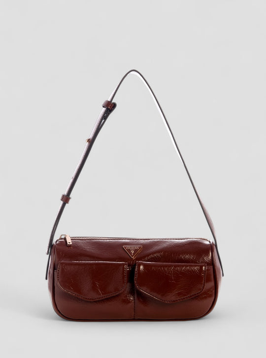 Add a rich touch of style to your accessories with the Brown Waldena Small Top Zip Shoulder Bag. Crafted from PU with a glossy finish, this sleek silhouette is accented with the iconic GUESS triangle logo plaque. Featuring dual front flap pockets for added function, an adjustable shoulder strap, and shiny gold hardware, it’s the perfect compact bag for effortless everyday wear.