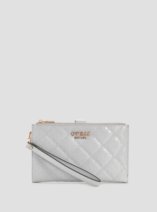Keep your essentials organized and stylish with the Grey Laurel Organiser Wallet. Made with a base of Quilted G shine PU and trimmed with G shine PU, this wallet features shiny gold hardware and a detachable 7" wrist strap. With multiple slip pockets, card slots, and zip pockets, as well as a phone pocket and snap closure, you'll have all your necessities at hand.