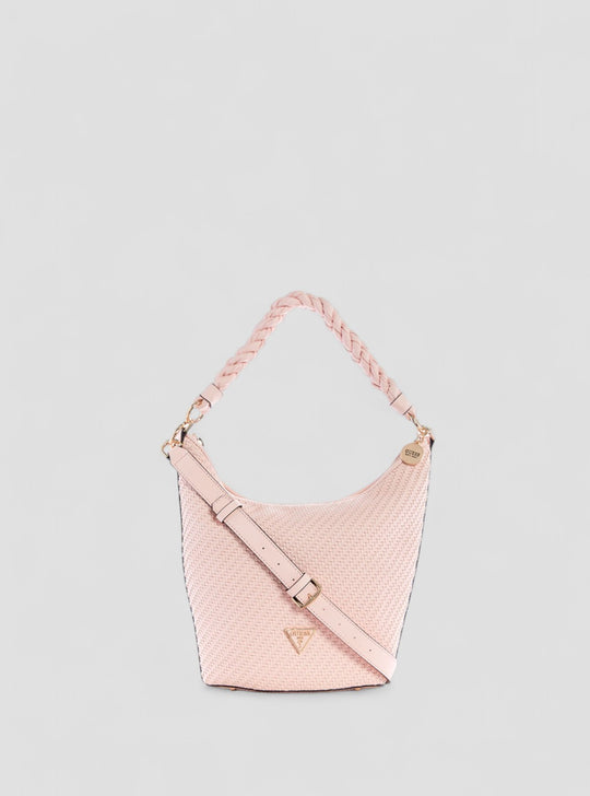 GUESS Womens Pink Woven Hassie Bucket Hobo Satchel VG839702 Front View GUESS Womens Pink Woven Hassie Bucket Hobo Satchel VG839702 Front Side View GUESS Womens Pink Woven Hassie Bucket Hobo Satchel VG839702 Inside View GUESS Womens Pink Woven Hassie Bucket Hobo Satchel VG839702 Back View