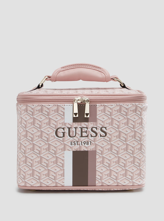 Our Rose Logo Wilder Beauty Case will become your new go-to for carrying all your beauty essentials in style. Designed with a G-cub logo upper, this beauty case features an external zip closure, deep internal compartments, internal mesh zip compartment, a top handle strap, and GUESS logo detailing. Perfect for travel and pairing with our Rose Logo Wilder Suitcases this season!