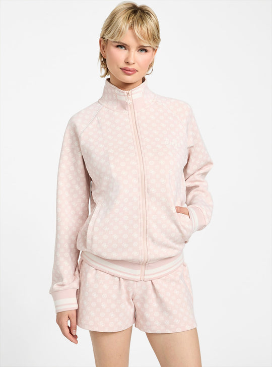 Stay cozy and stylish with the Eco Pink Logo Aggie Active Sweatshirt. Crafted from a soft stretch blend, this sweatshirt features an all-over logo print for a signature touch. Designed with a full zip closure, ribbed cuffs, and a stand-up collar, it combines comfort and style — perfect for pairing with joggers, shorts, or jeans for a laid-back look.