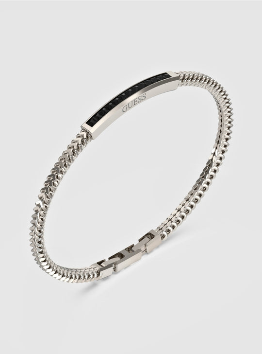 Elevate your look with the Silver Crystal Plate Bracelet. Crafted in polished stainless steel, this sleek bracelet features a refined plate detail inlaid with black crystals and the engraved GUESS logo. A modern accessory that combines masculine style with subtle sophistication, perfect for everyday wear or special occasions.